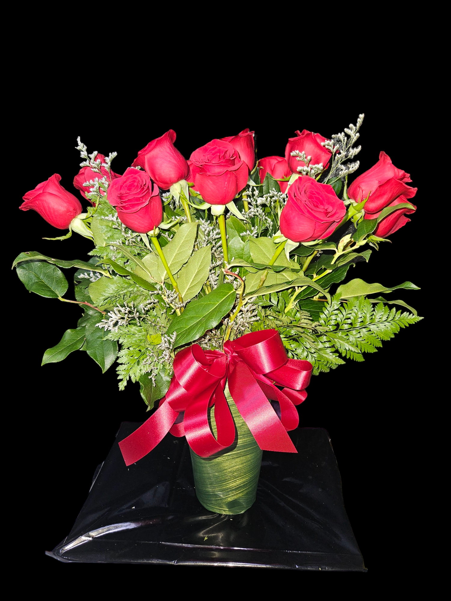 ONE DOZEN RED ROSE'S WITH GREENERY AND FILLER.