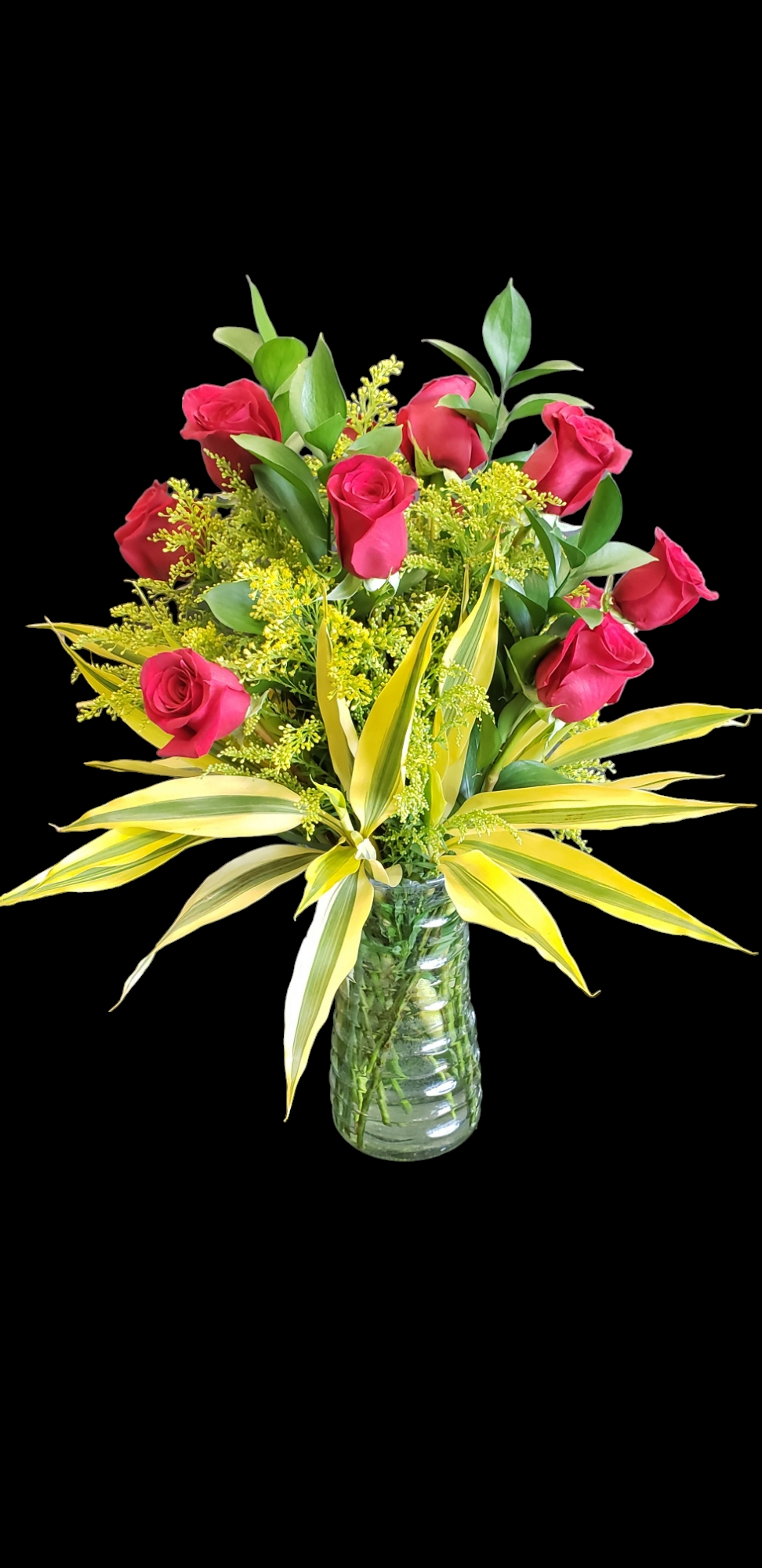 ONE DOZEN RED ROSE'S WITH GREENERY IN AN UNTRADIONAL WAY AND YES IN A VASE.