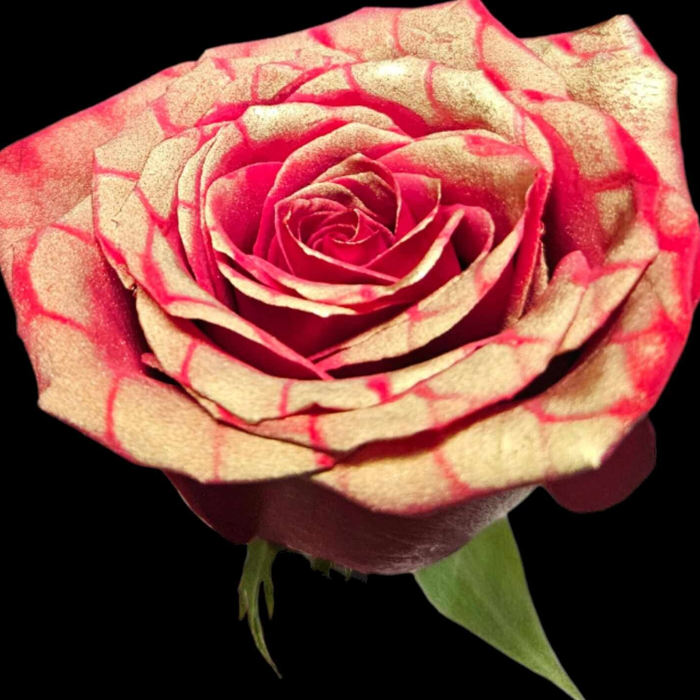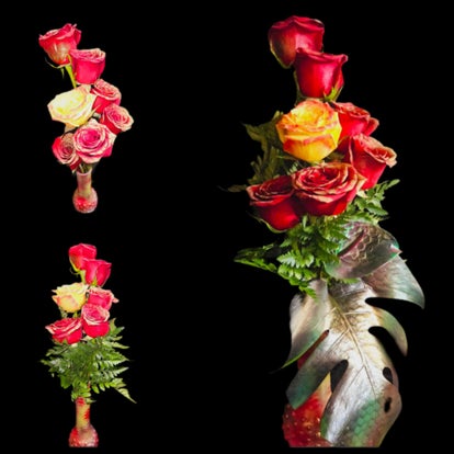 SEVEN RED ROSE'S WITH GOLD REPTILIA AND ONE YELLOW ROSE WITH RED REPTILIA STYLE IN A VASE WITH ELEPHANT EAR LEAF WITH REPTILIA STYLE.